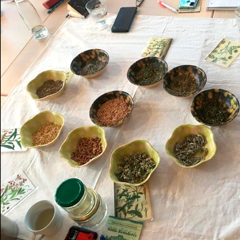 André Freymann stellte im Kurs ausgewählte immunstärkende Pflanzen vor, die Körper, Geist und Seele von Grund auf nähren und stärken und kreierte gemeinsam mit den Teilnehmerinnen individuelle Mixturen  (Bitterkraftpulver, Edelkastanienhonig) für den Hausgebrauch.